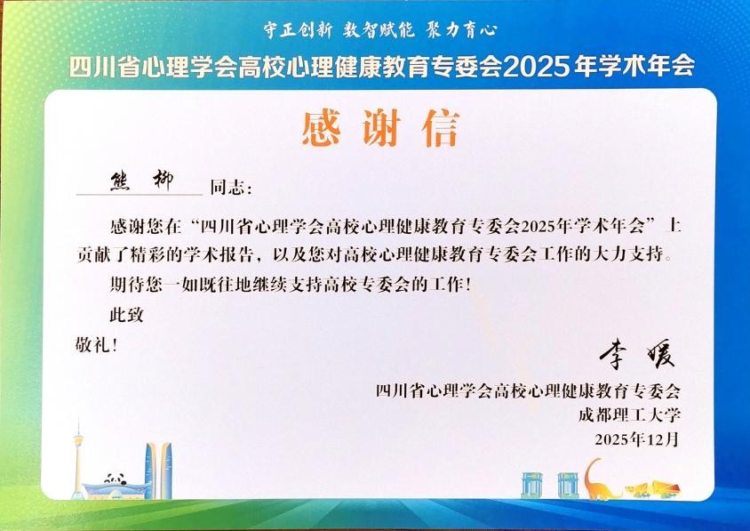 为进一步提升我校心理健康教育工作水平,加强校际间心理健康教育工作的交流,12月4-6日,我校心理健康教育与咨询中心选派3名教师前往成都理工大学,参加“四川省心理学会高校心理健康教育专委会2025年学术年会”。心理中心熊柳老师受邀做学术论文报告。