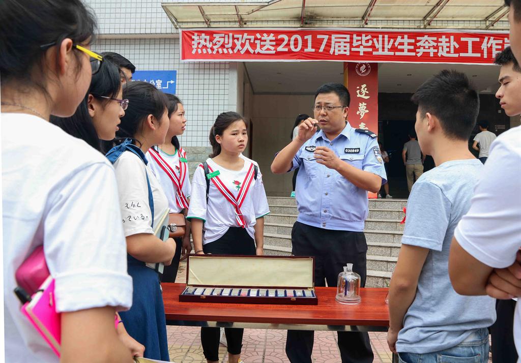 讲座邀请游仙区公安局禁毒大队教导员廖永斌和游仙区疾控中心副主任医师杜婵娟为同学们进行禁毒和防艾教育,由保卫处处长李仕平主持。首先由杜婵娟为同学们进行了艾滋病防治知识宣讲。她通过与同学们的互动问答,生动细致讲述了艾滋病的概念、传播途径、危害和艾滋病与毒品的关系。随后廖永斌利用视频、图片和各种现实案例,深刻阐述了国际国内和四川的毒品形势、常见毒品知识、禁毒法律以及青少年防范吸食毒品的七招,使同学们认识到毒品的危害,了解市面上的常见毒品,帮助他们树立“珍爱生命,远离毒品”的意识。讲座结束后,廖永斌在综合楼门口为同学们展示了常见的毒品样本,以及新型毒品的吸食工具等,提高同学们对毒品的警惕。