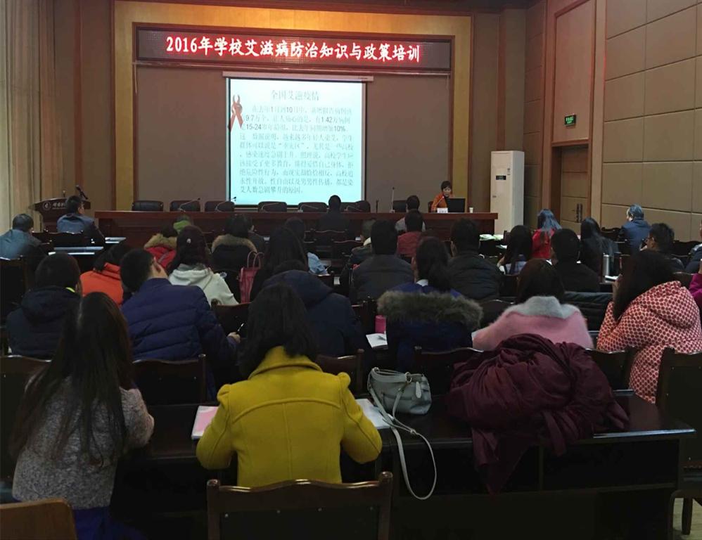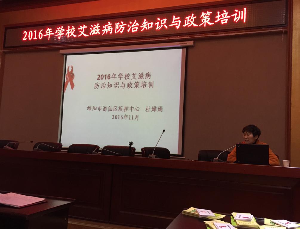 11月29日下午,我校邀请绵阳市游仙区疾控中心项目办科长、主治医师杜婵娟对全校辅导员和防艾工作相关人员进行了《2016年艾滋病防治知识与政策培训》。杜婵娟在阐明今年宣传活动的主题“携手抗艾,重在预防”之后,运用生动详实的案例讲述了全国艾滋病的疫情,艾滋病的概念、传播途径、发病历程、高危行为、流行特点及危害等相关知识。她指出当前我国艾滋病防治进入攻坚阶段,高校学生群体是感染艾滋病的“重灾区”,希望广大学校工作者按照学校艾滋病防控“3+2”方案深入落实艾滋病防控工作,加强艾滋病知识的宣传和预防。