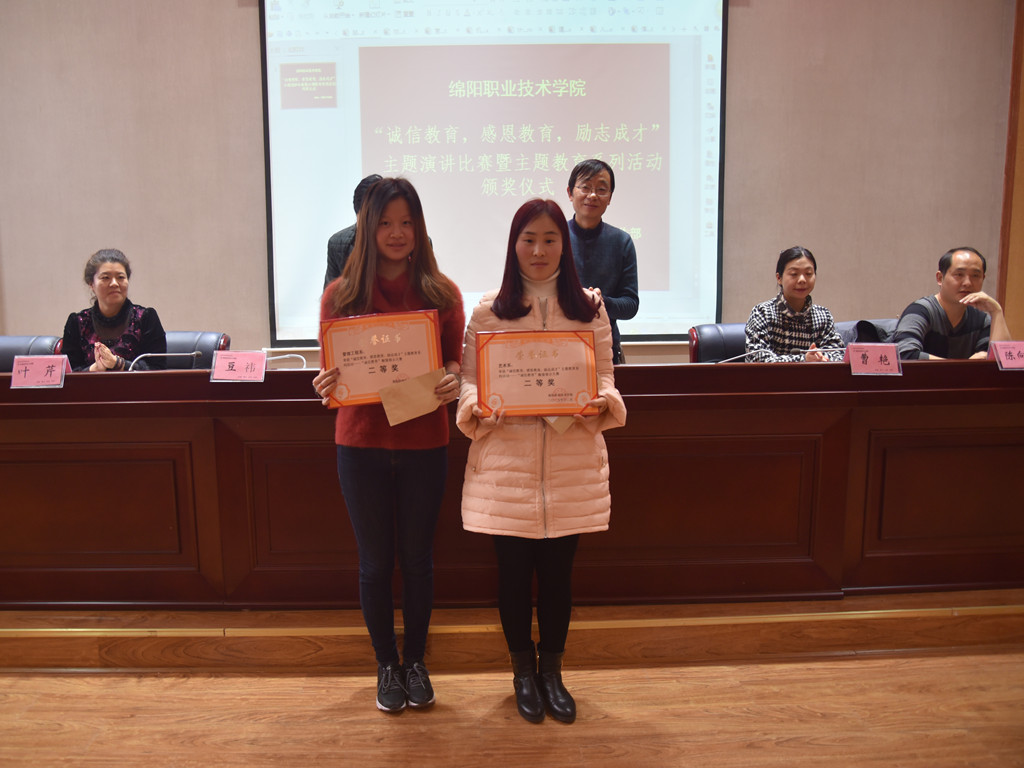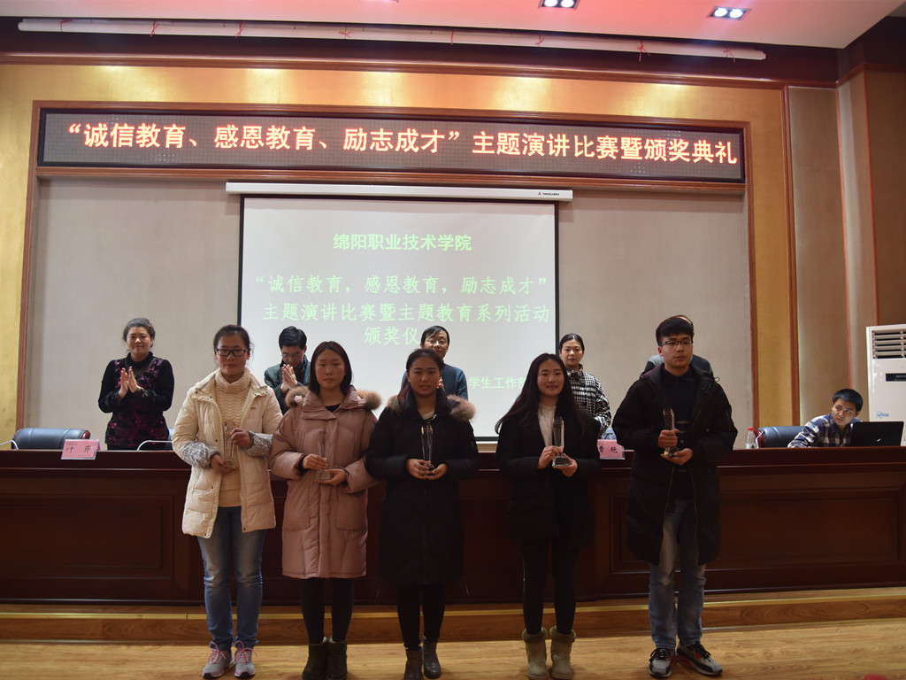 演讲比赛结束后,朱成友宣读了关于表彰2015年“诚信教育,感恩教育,励志成才”主题教育系列活动获奖集体和个人的决定,学工部有关领导为本次“感恩于心,助我成长”主题征文比赛,“光影青春,奋斗你我”微电影摄制及多媒体制作大赛,“感动绵职”人物评选活动,“诚信、感恩、励志”主题班会,“谁的青春不奋斗”主题演讲比赛等系列主题教育活动中的22个先进集体、33名先进个人颁发了荣誉证书。