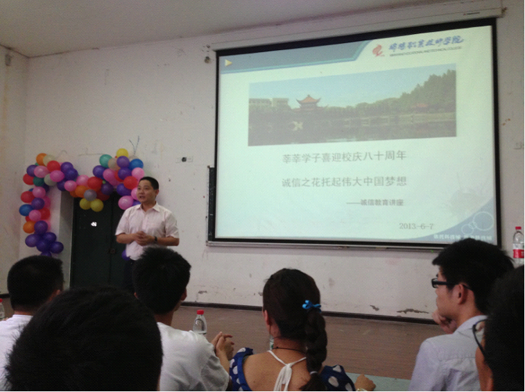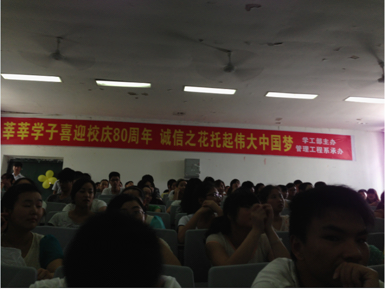 根据四川省教育厅关于转发《教育部办公厅关于开展高校学生资助诚信教育主题活动的通知》的和学院党委关于《广泛开展“实现伟大中国梦、建设美丽繁荣和谐四川”主题教育活动实施方案》的通知精神,为增强我院大学生的诚信意识,提高学生综合素质,强化资助育人工作,维护校园稳定、社会和谐,学工部学生资助科以“诚实守信”为主题,以“立德树人”为主线,结合“我的中国梦”的主题教育活动,6月7日下午,由学工部主办,管理工程系承办的“莘莘学子喜迎校庆八十周年 诚信之花托起伟大中国梦想”的专题讲座在教学楼第二阶教室举行,此讲座是学生资助科“诚实守信”系列活动之一,此次讲座由管理系副主任陈波主讲,全院各系近200多名学生和辅导员参加了专题讲座会。