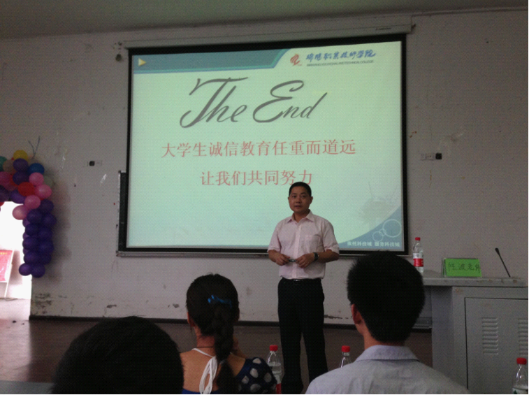 在讲座中,陈主任结合实际,利用古今典型案例主要从“诚信的内涵”、“诚信的重要性”、“大学生不诚信的突出表现”以及“大学生应遵守的诚信规范”等方面进行深入浅出的讲解,陈主任幽默风趣的演讲风格、翔实的资料、发人深省的案例、制作精美的PPT给学生留下了很深刻的印象,会场上不时响起阵阵掌声和笑声。最后,陈主任以“诚信是道路,诚信是智慧,诚信是成功,诚信是财富的种子”鼓励大家做一名诚实守信的合格大学生。