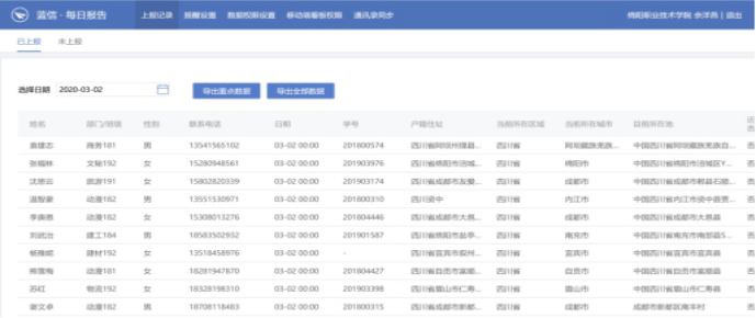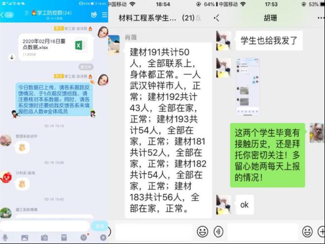 全面摸排,精准反馈。疫情防控,信息全面、精准是关键。为确保学生情况摸排工作横向到边、纵向到底,精准掌握、实时统计,学工系统定期召开视频会议,传达学校防控工作领导小组相关要求,安排部署相关工作,认真落实疫情防控“日报告”“零报告”制度,建立疫情信息报送QQ和微信群,建立疫情防控信息台账,做到专人负责、实时跟踪、逐一摸底,不漏一人,确保“底子清楚”“数据精准”“信息畅通”,“听声见人”全覆盖,实现学生信息收集汇报工作的常态化、制度化。1月31日,学工系统下发寒假期间学生流动情况统计表,对学生动向和健康状况进行首轮摸排。2月9日起,学工系统通过手机客户端“蓝信+”APP对学生情况进行摸排,采集信息包括学生基本信息、当前所在城市、近一个月是否到过湖北(具体地点)、有无接触湖北、武汉籍人士、有无发热、乏力、干咳等症状等。学工部派专人负责每日定时汇总数据,筛查重点数据,反馈到各系、各班,辅导员跟踪重点关注学生情况并及时反馈,做到疫情防控有源可查、有线可控、及时掌握、有效应对。学工系统通过各班统计、辅导员摸排以及“蓝信+”系统填报等方式对四类人员(湖北籍、往返湖北、现在人在湖北、接触过湖北籍人士)进行详细摸排,对全校98名重点学生建立台账,实时关注其身心健康状况。学工系统用认真细致的工作获得学生的理解和配合,把阻击疫情的各项要求落细落实,为春季开学做好了铺垫工作。