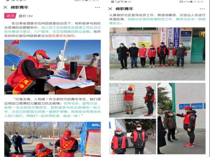 同舟共济,青春“战疫”。党有号召,团有行动,在党委的坚强领导下,校团委通过各级团学组织,号召全校青年学子积极投身疫情防控阻击战中。我校青年学子积极响应号召、不畏艰险,主动支援、不计酬劳,以实际行动唱响青春赞歌。他们有的捐款捐物、宣传动员,有的响应号召,坚定奋战在抗疫一线。他们勇于担当、敢于作为,充分展现出当代大学生奋勇当先的责任与担当,为打赢疫情阻击战贡献青春力量,一颗颗年轻炙热的心成为战“疫”中最靓丽的风景线!