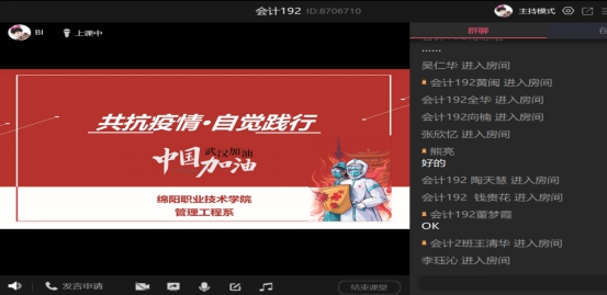 辅导员还要求同学们要积极配合学校的防疫工作,尤其是关于返校纪律和每日蓝信健康状况提交的要求;督促同学们养成健康良好的生活习惯,丰富居家生活;并要求同学们充分利用延迟开学的充裕时间,合理制定学习计划,按照学校开展线上教学的要求,树立自觉学、主动学的意识,主动与任课教师沟通交流,在家认真学习,多读书、勤思考。线上班会期间,同学们重点围绕如何理性看待疫情,疫情期间如何做好自我防护,如何开展新学期的网上学习等问题进行了积极的讨论。