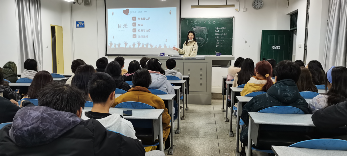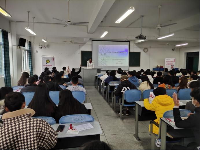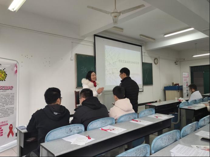 11月25日下午,在ZF301教室进行了大学生预防艾滋病知识讲座,这次讲座是由信息工程系青苹果协会承办,2020级新生代表150余人参与了此次讲座。讲座邀请了绵阳市游仙区疾控中心杜婵娟老师主讲。讲座中杜老师与同学们互动了解同学们对预防艾滋病知识的知晓情况,从不同角度分析了全国艾滋病的分布情况,用数据展示了四川省内艾滋病的严峻形势及青年学生感染艾滋病的状况。并从艾滋病的特点、传播途径、传播方式、治疗、危害和预防等方面,向大家宣传和介绍预防艾滋病知识。最后她利用防艾知识互动小游戏,寓意深刻地进一步让同学们感受到艾滋病传染的危害,并认识到保护好自己的重要性。