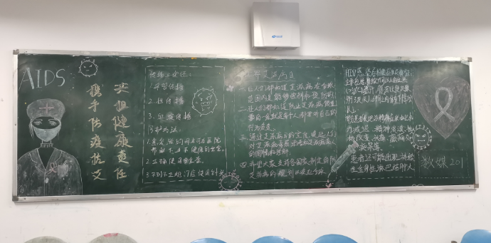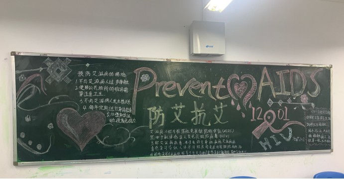11月29日晚,学生工作部和院团委组织各班在综合楼教室召开“携手抗疫防艾 共担健康责任”主题班会,他们利用宣传视频、多媒体和现场互动活动,学习艾滋病防控知识,宣传和普及艾滋病防控措施。同时还在各班开展“携手抗疫防艾 共担健康责任”主题黑板报评比,各班利用丰富多彩、形式多样的主题黑板报,营造携手抗疫防艾的校园氛围,加强同学们的防艾意识。