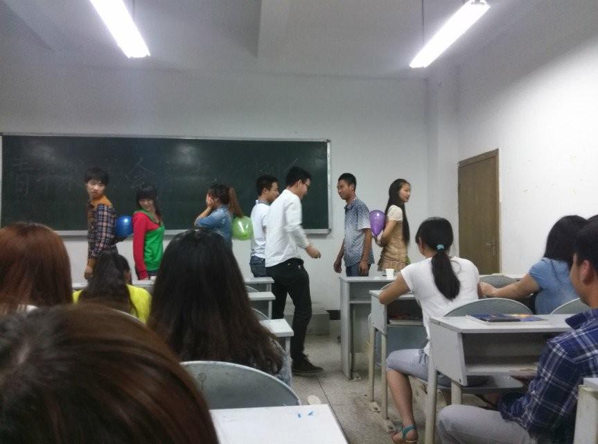 为了提高协会成员的积极性,让大家更加团结、更有向心力,了解共同协作的心理过程,青苹果协会在5月8号晚在ZB209组织了“心心相惜”“水的传递”等小游戏,心心相惜主要是让男生和女生搭配背靠背夹气球,哪组能在最短时间内压破所有气球则赢;水的传递是挑选出五人,让他们用嘴衔着水杯,把第一个人杯里的水依次传到最后一个人的杯里,传的最快的一组获胜。