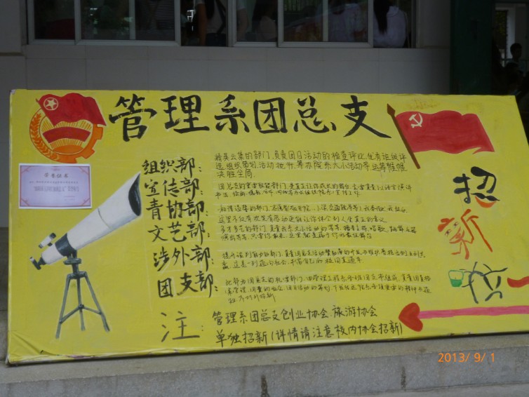 迎新工作刚基本结束,我系团总支的纳新工作也拉开了帷幕。为了使新生对系团总支这一组织有更系统、更全面的的认知,我系团总支进行了广泛宣传与细心介绍。为了给2013届新生提供更多展示自己优势与特长的机会和平台,也为了吸引更多的更优秀的人才进团总支,我们的纳新工作可谓是紧锣旗鼓,细心策划。在我们各部门的分工协作下,管理系团总支又引进了许多德才兼备、有强烈责任心和奉献心与组织能力的新干事。为我们的团总支注入新的血液与力量。