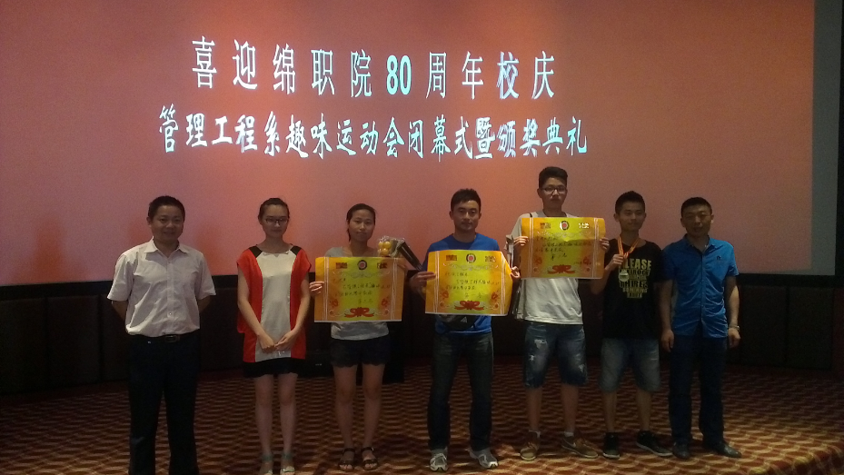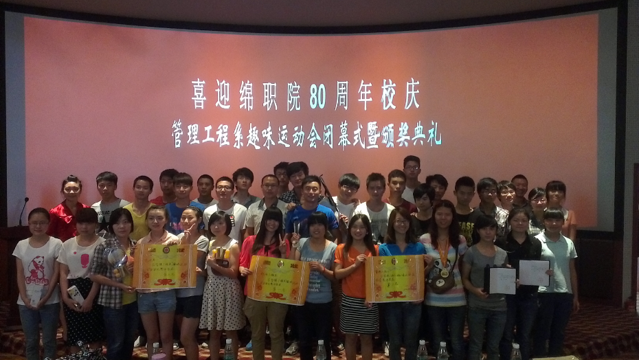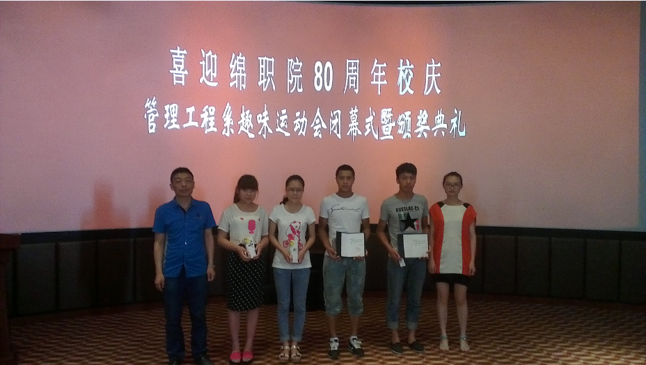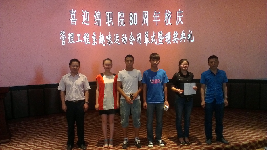 2013年5月30日下午4:30,由管理工程系学生会体育部举办的“喜迎绵职院80年校庆·趣味运动会闭幕式暨颁奖典礼”在我院3D(一阶)教室隆重举行。本次活动邀请嘉宾有我系陈波、田小平、王文俪、尹凤茗老师,以及各系学生会主席。活动由管理系副主任陈波老师致开幕辞,引导大家要将“体育梦”、“健康梦”助推“中国梦”。