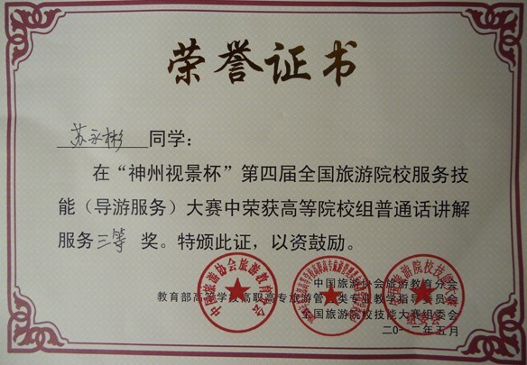 2012年5月8日,第四届全国旅游院校服务技能(导游技能)大赛在郑州旅游职业学院落下帷幕。本次大赛由中国旅游协会旅游教育分会、教育部高等学校高职高专旅游管理类专业教学指导委员会和全国旅游职业教育教学指导委员会联合主办,旨在贯彻落实国务院《关于加快发展旅游业的意见》的精神,促进旅游院校的专业教学水平和旅游管理专业学生导游服务技能的提高,为旅游院校、相关企业搭建交流合作平台,进而大力推动旅游职业院校教育教学改革和人才培养模式的创新。来自全国各省、市、自治区297所旅游院校的1021位学生参加了比赛。本次大赛规模之大、标准之高、覆盖范围之广,都是历届之最,受到了社会各界极大的关注,成为我国旅游界的一项盛事。