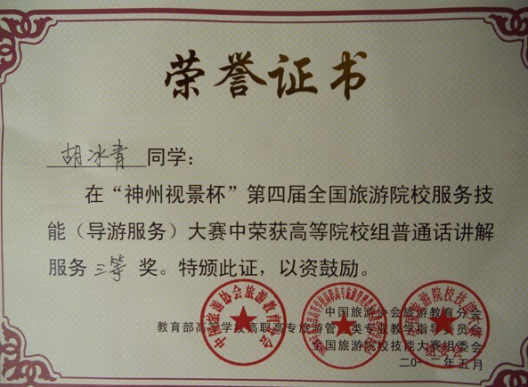 我院管理工程系旅游101班胡冰青同学和财务管理102班苏永彬同学均荣获高等院校(含本科、高职高专院校)普通话讲解组三等奖。